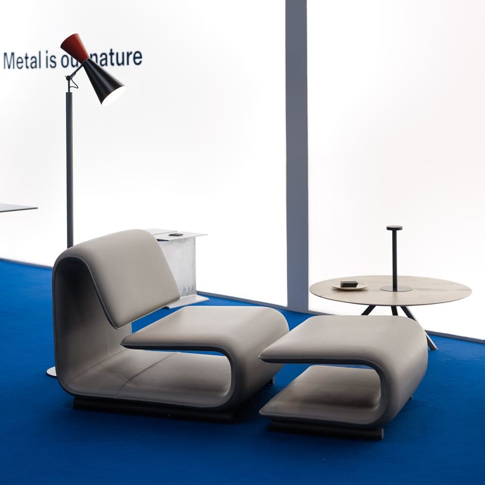 В центре выставочного пространства — стеклянный стол Heb, кресло Clip, табурет Italia, стеллаж Zinco и бестселлер Desalto стол Maxi Clay, о котором мы подробно рассказывали в нашем блоге.