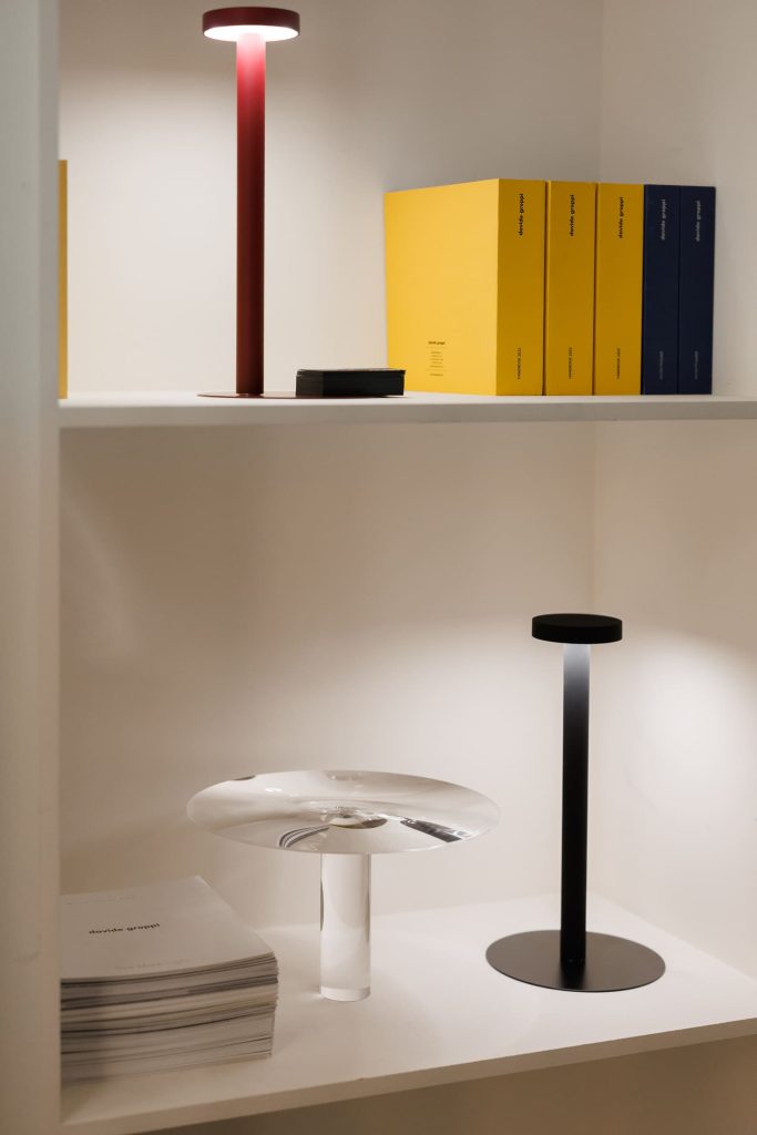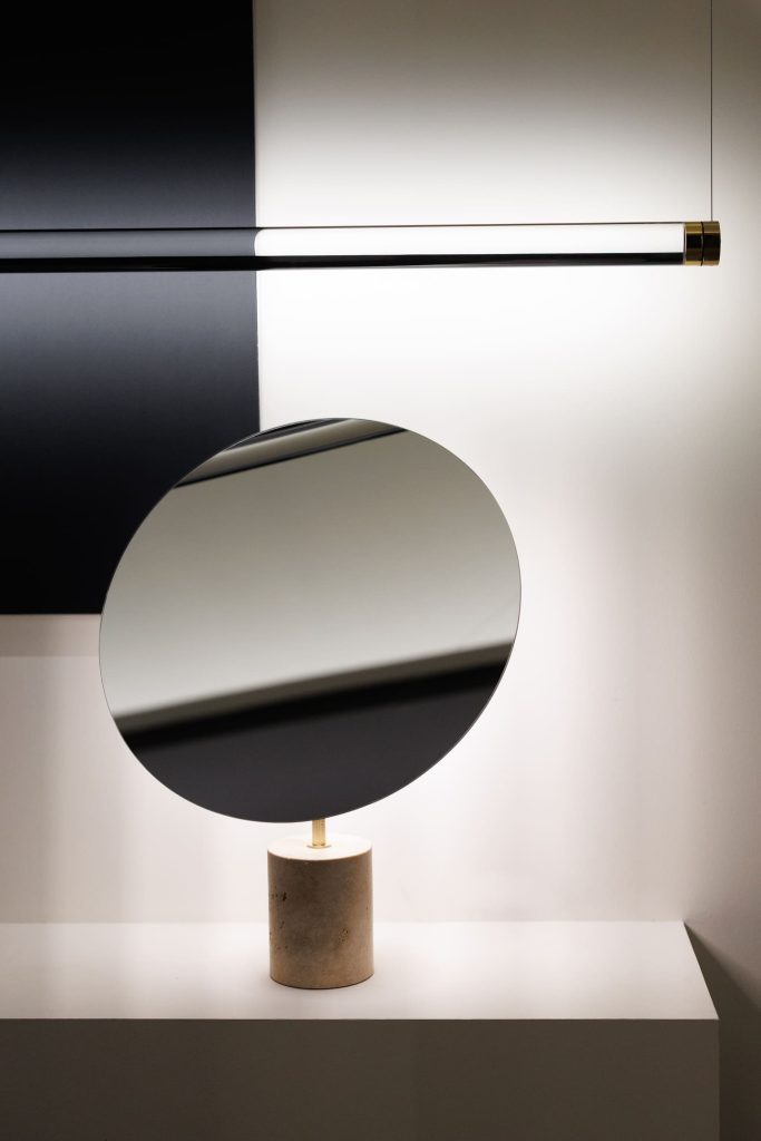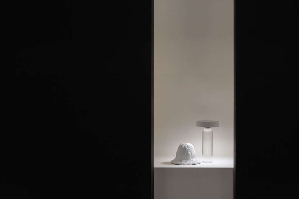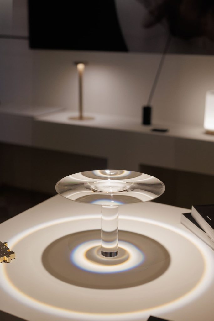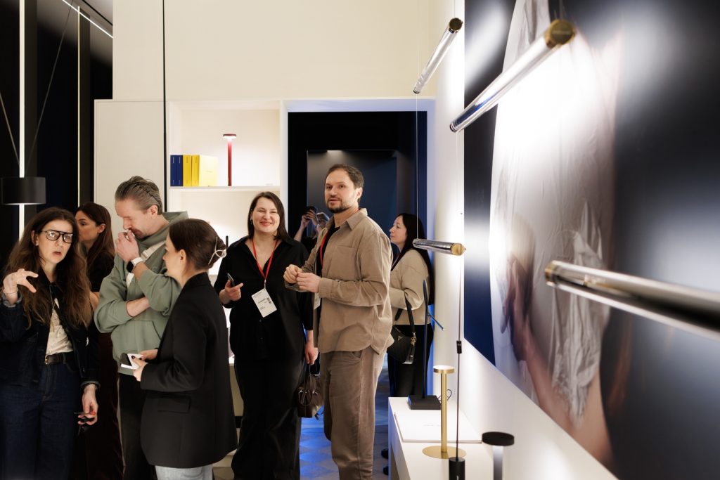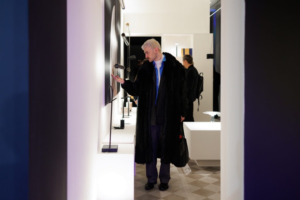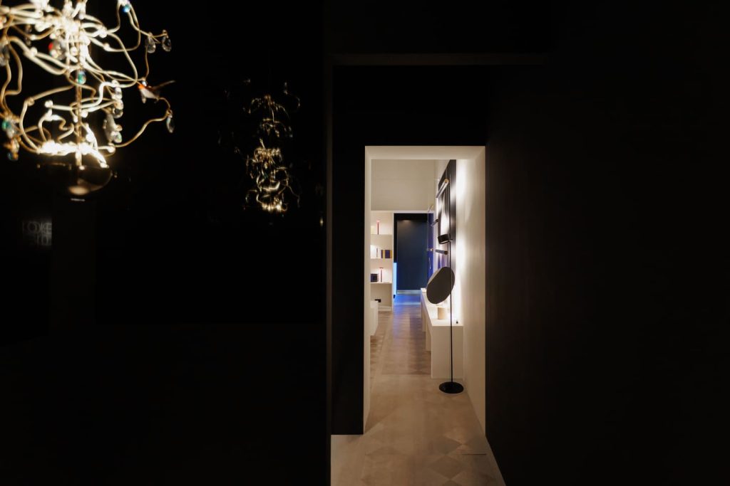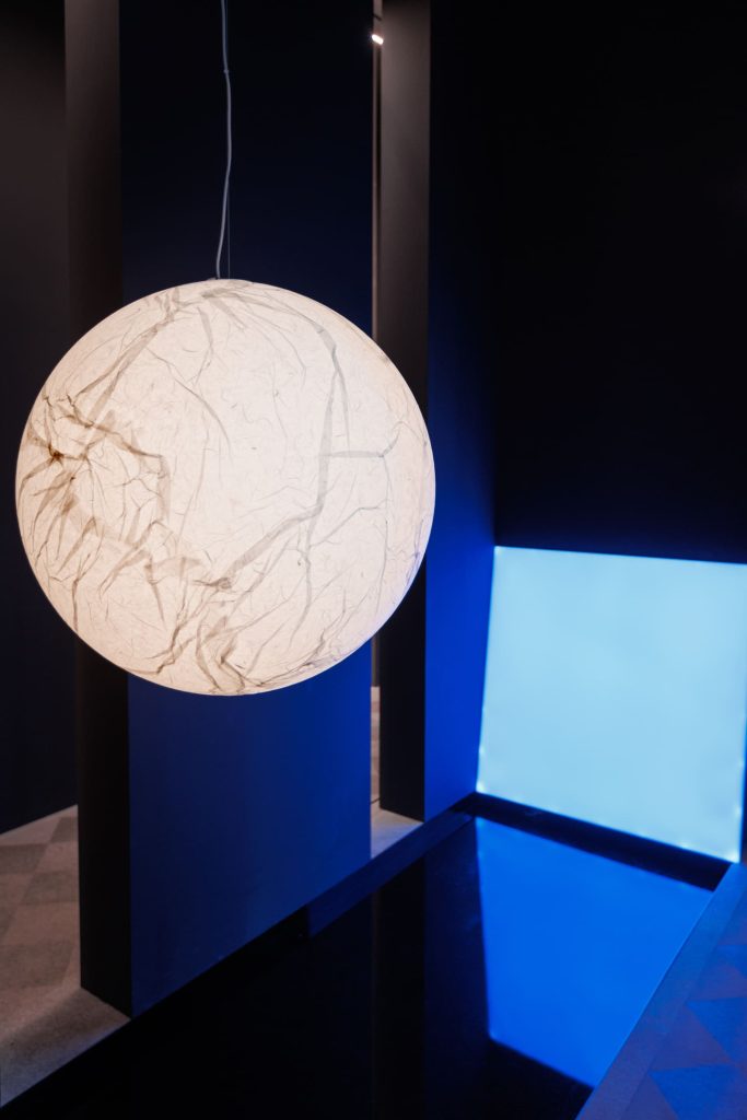 Подобно концепции самого бренда Davide Groppi, стенд работает с темой прозрачности и невидимости в том числе с помощью цвета: белый и черный становятся необходимой пустотой, в которой свет появляется и так же чисто исчезает. А наполненность, живость и объем света обеспечивает глубокий синий — ночь, в которой есть воздух и глубина.