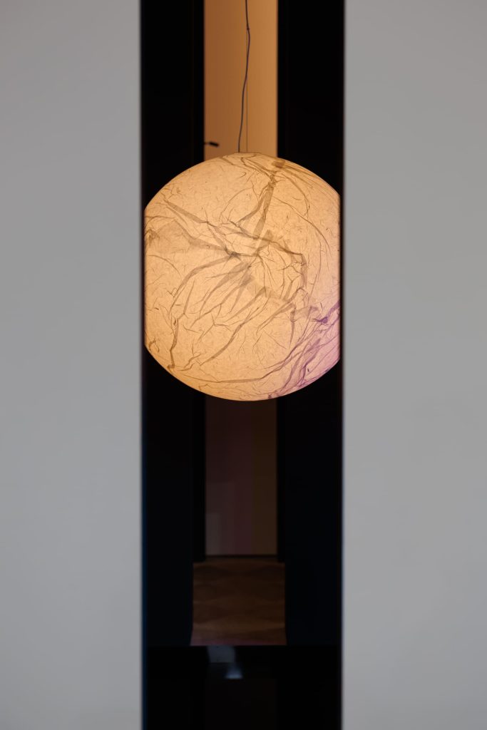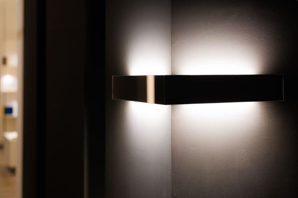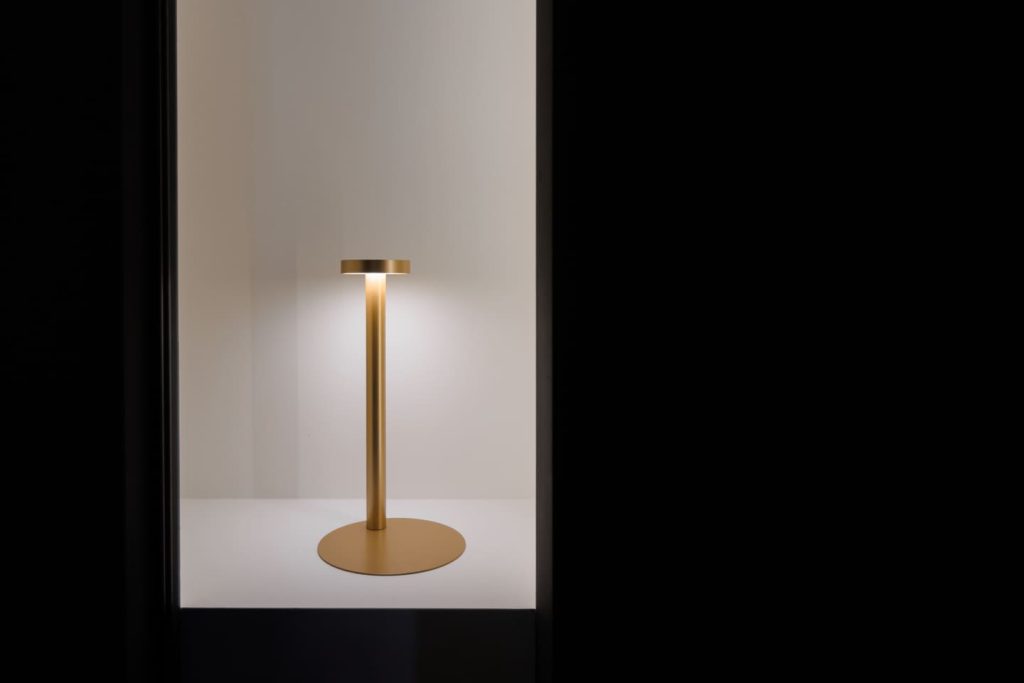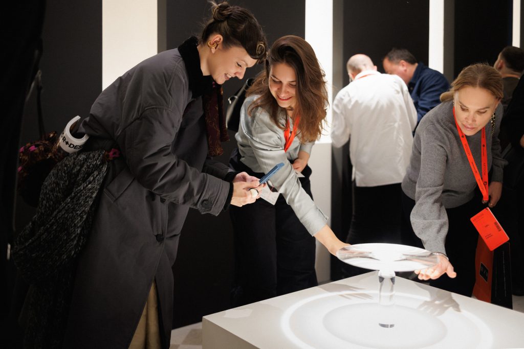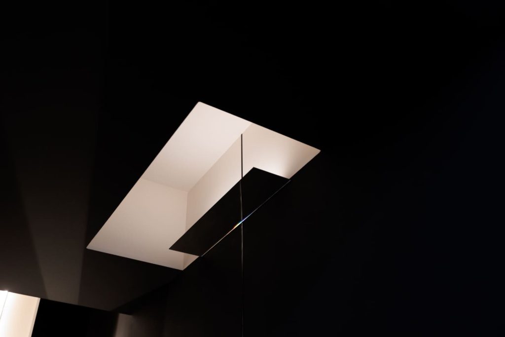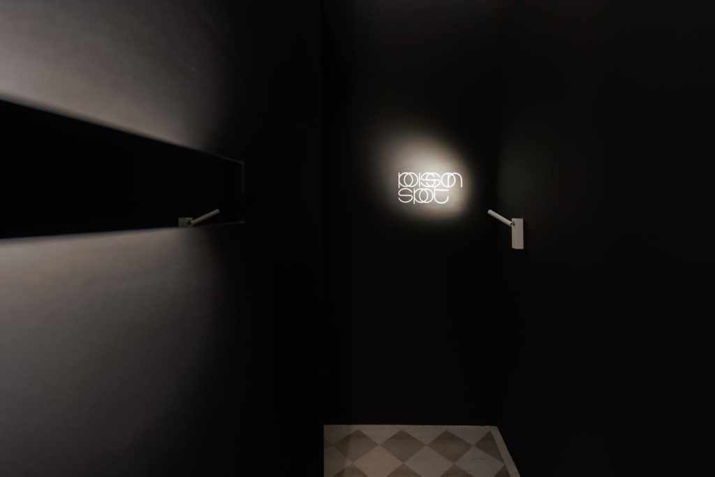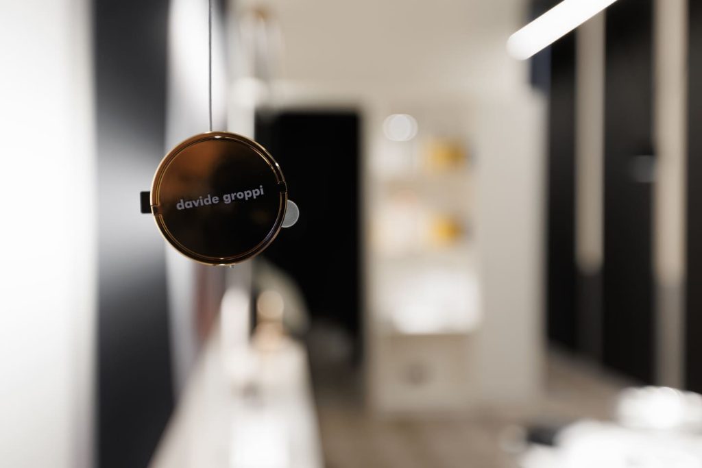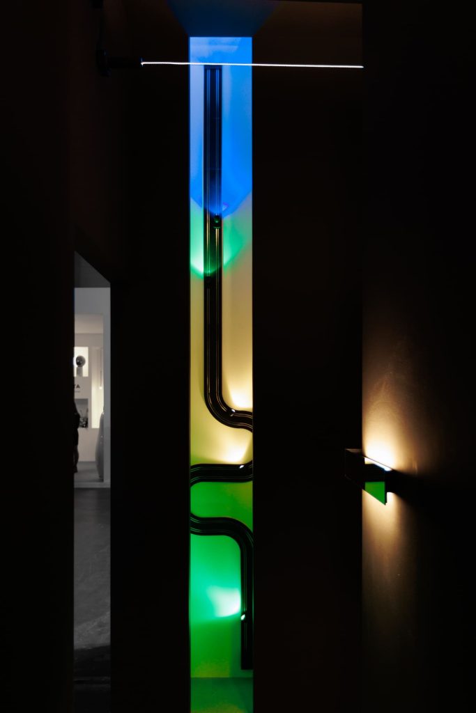 Подобно концепции самого бренда Davide Groppi, стенд работает с темой прозрачности и невидимости в том числе с помощью цвета: белый и черный становятся необходимой пустотой, в которой свет появляется и так же чисто исчезает. А наполненность, живость и объем света обеспечивает глубокий синий — ночь, в которой есть воздух и глубина.
