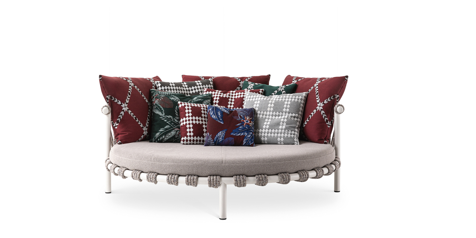 Коллекция Trampoline разработана Патрисией Уркиолой с акцентом на расслабленный отдых на свежем воздухе. В основе конструкции дэйбеда лежит каркас из окрашенной нержавеющей стали. Характерная черта модели — сложное плетение из полипропиленового и нейлонового шнура. Этот элемент создает упругую поверхность, которая работает по принципу батута, обеспечивая эластичную поддержку. Комплектация включает мягкое сиденье и три подушки для спинки. Обивка выполнена из специализированных тканей, устойчивых к воздействию внешней среды. Наполнитель из полиуретана и переработанного ПЭТ-волокна хорошо держит форму и подходит для уличного использования. Модель Trampoline органично смотрится на открытых террасах, в саду или просторных интерьерах. Дополнительно можно заказать декоративные подушки для индивидуальной настройки комфорта.