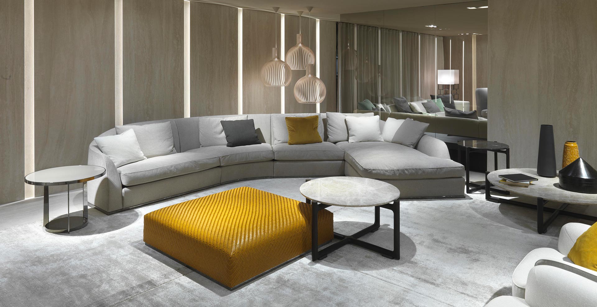 Система Alfred полностью модульная: отдельные элементы можно комбинировать для создания прямых, угловых или островных композиций, подходящих под конкретную планировку помещения. Обивка доступна в двух вариантах: съемные чехлы из ткани или фиксированная кожаная отделка, подчеркивающая статусность предмета.