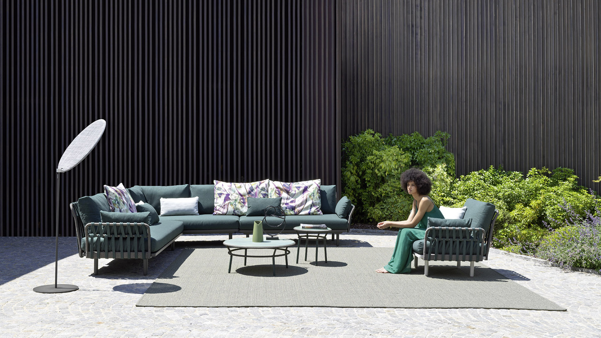 Модульный диван Emma Cross от Varaschin, дизайнер Моника Армани, — элегантное и функциональное решение для террасы, патио или лаунж-зоны. Диван создан на основе прочной алюминиевой конструкции с порошковым покрытием, а спинка и подлокотники обиты фирменной акриловой тканевой лентой, устойчивой к атмосферным воздействиям и ультрафиолету. Съёмные подушки с наполнителем Dryfeel® обеспечивают комфорт и лёгкость ухода. Диван доступен в композиции из трех модулей и в отделке из материалов в бежевом оттенке из каталога бренда.