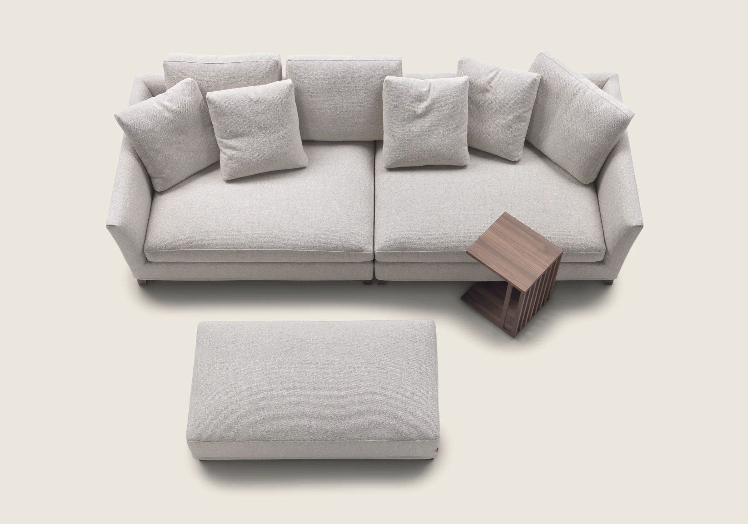 Визуальную легкость модели придают ножки из массива каналетто ореха или ясеня, доступные в различных вариантах тонировки. Натуральная текстура древесины контрастирует с мягкой обивкой, которую можно выбрать из коллекции кожи или текстиля. Система модулей позволяет формировать различные конфигурации, адаптируя диван под геометрию конкретного пространства.