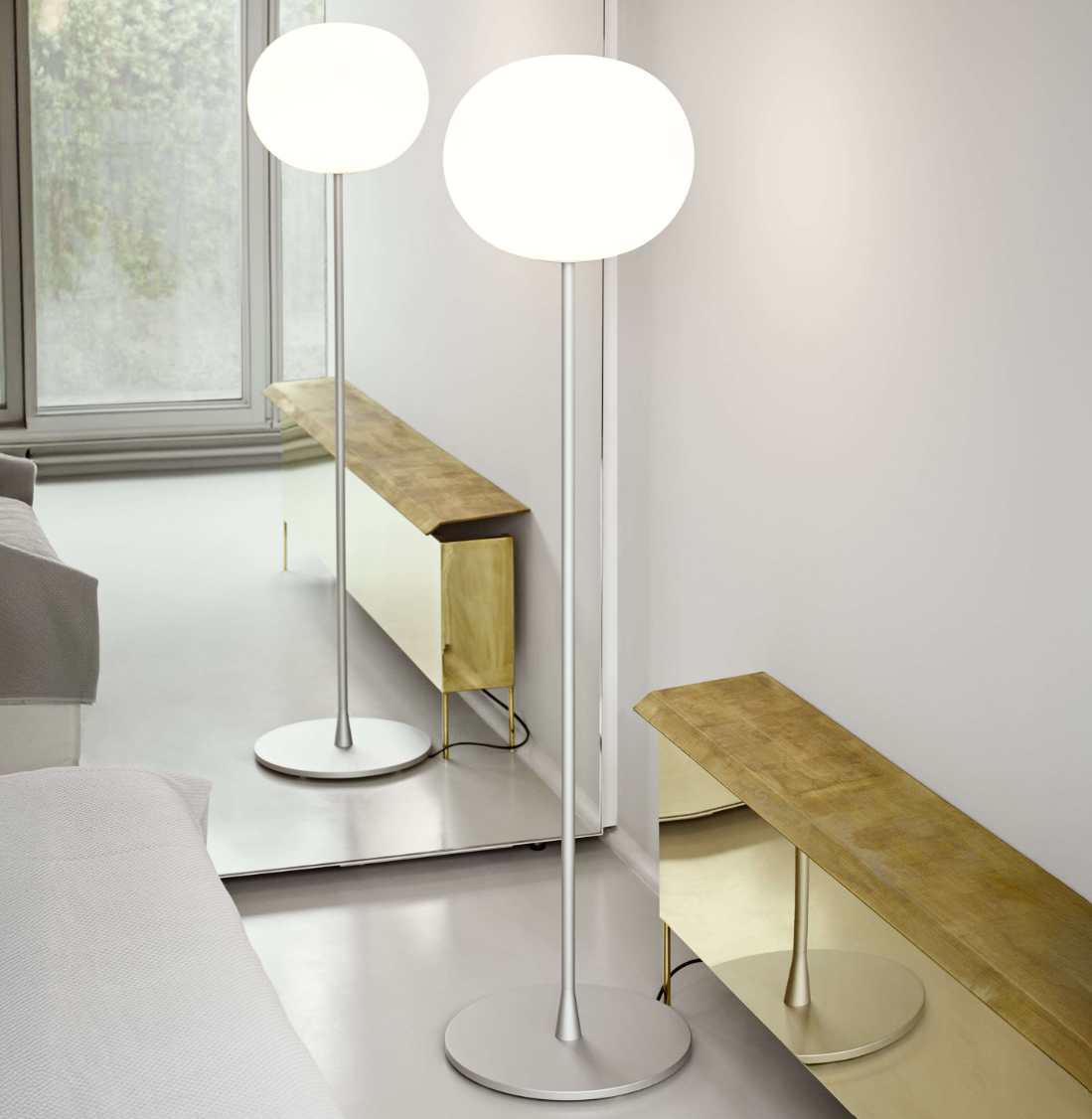 Напольные светильники Noctambule, дизайн Константин Грчич, 2019 — модульная модель, состоящая из соединённых стеклянных элементов, формирующих выразительную вертикальную композицию высотой до 2,17 м. Конструкция объединяет цилиндрические и полусферические элементы из прозрачного выдувного стекла, основание и кольца из литого алюминия, внутренние боковые элементы из гидроформованной стали и внешние кольцевые рассеиватели из опалового силикона, обеспечивающие мягкое равномерное освещение.
