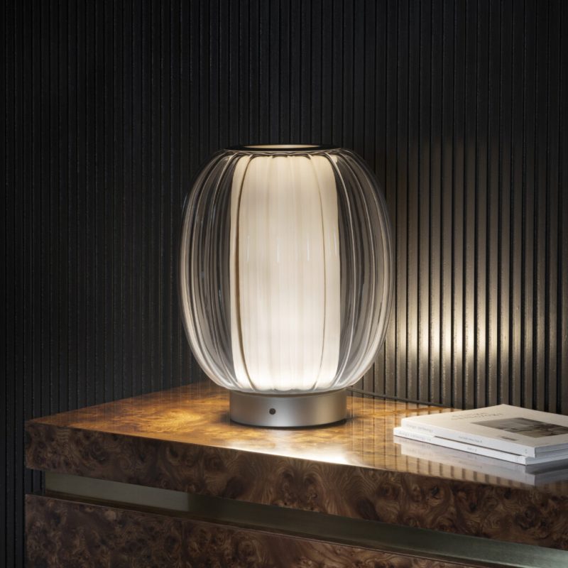 Каждый плафон выполнен из вручную выдуваемого хрусталя с лёгким иридесцентным покрытием, что придаёт ему уникальный блеск и глубину. Настенный светильники Dew Drop представлены в трех вариантах размеров. Диаметр Dew Drop Large составляет 22 см.