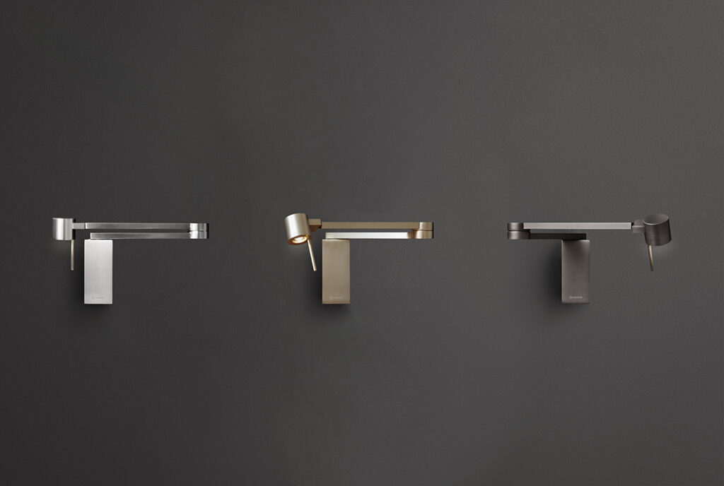Модель оснащена двойным шарнирным механизмом, позволяющим регулировать положение как у основания, так и в месте соединения двух плеч, а также полностью регулируемой головкой для точной настройки светового потока. Каркас выполнен в отделке сатинированная латунь, подчёркивающей строгий и современный характер изделия.