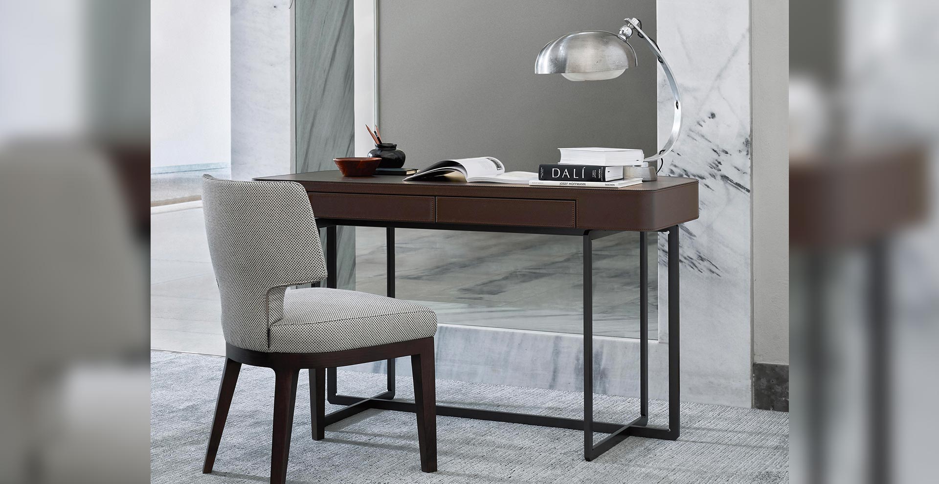 Характерная черта модели — использование плотной седельной кожи в отделке. Этот материал добавляет тактильный комфорт и со временем меняется, обретая индивидуальные черты. Все швы мастера Flexform выполняют вручную. Эргономичная высота и просторная поверхность делают стол удобным для ежедневной работы, а сдержанный дизайн позволяет гармонично вписать его в современный кабинет или домашнюю библиотеку.