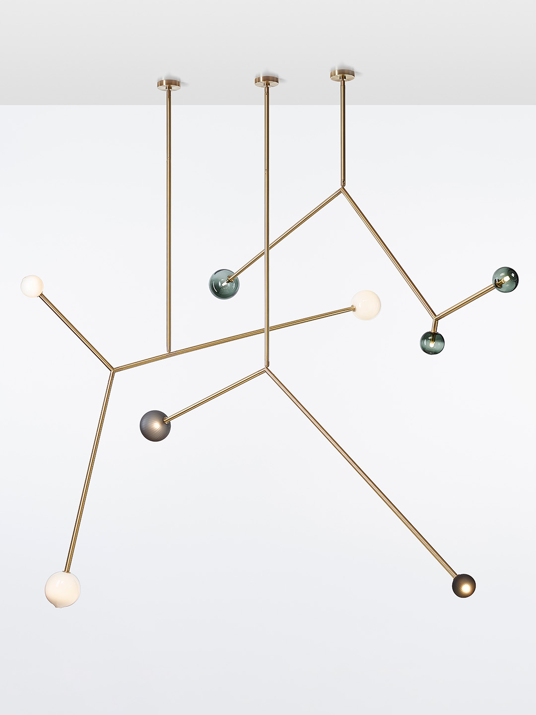 Подвесной светильник Angle 3.0 от SkLO представляет из себя латунную конструкция с тремя вытянутыми элементами, дополненную тремя плафонами из выдувного стекла. Благодаря ручному производству каждое изделие имеет едва заметные различия в весе и высоте, что придаёт светильнику индивидуальность и живое ощущение движения. Светильник доступен в девяти оттенках стекла и четырёх отделках металла, что позволяет адаптировать его к различным интерьерным стилям. В наличии версия с белыми стеклянными плафонами и металлом в отделке Brushed Brass. Ширина светильника 259 см. Минимальная высота подвеса — 142 см, высота свыше 211 см доступна по запросу.