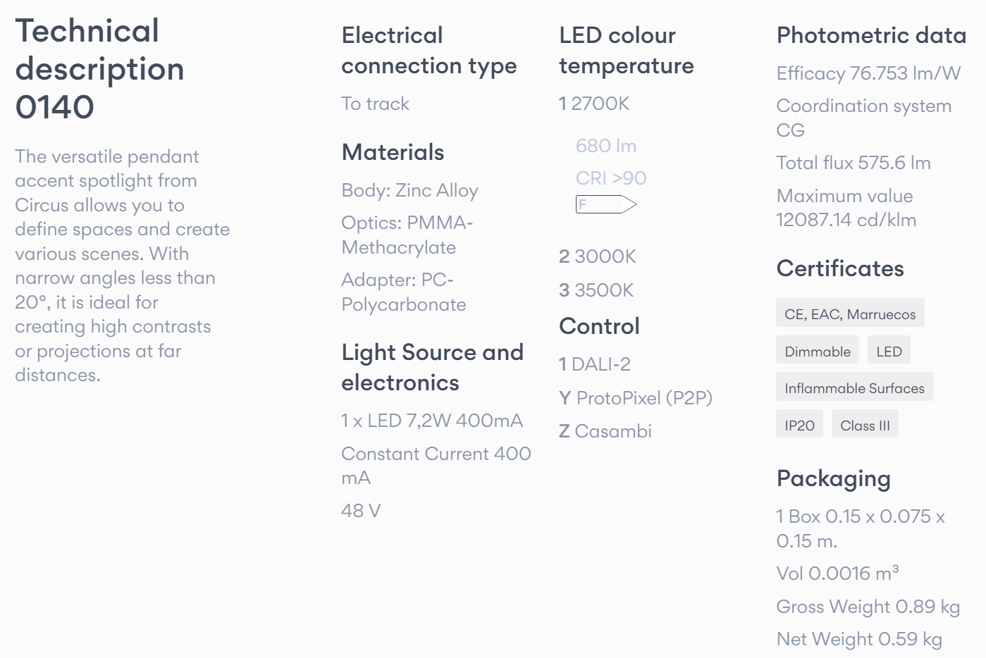 Подвесной светильник Circus 0140 (Narrow)— один из элементов коллекции Circus. Это акцентный прожектор с узким углом света менее 20°, идеально подходящий для создания контрастного освещения и проекций на дальние расстояния. Корпус диаметром 4 см и длиной 14 см выполнен из цинкового сплава, оптика из метакрилата, адаптер из поликарбоната. Оснащён LED 7,2W с высоким индексом цветопередачи (CRI>90) и выбором цветовой температуры 2700K, 3000K или 3500K. Управление возможно через DALI-2, ProtoPixel или Casambi. Светильник доступен в чёрном и бежевом цвете. Максимальная длина подвеса 200 см. Доступны варианты светильника с углом света 20–40° для средних контрастов и средних расстояний (Medium) и Wide с углом света более 40° для мягкого освещения и ближних зон.