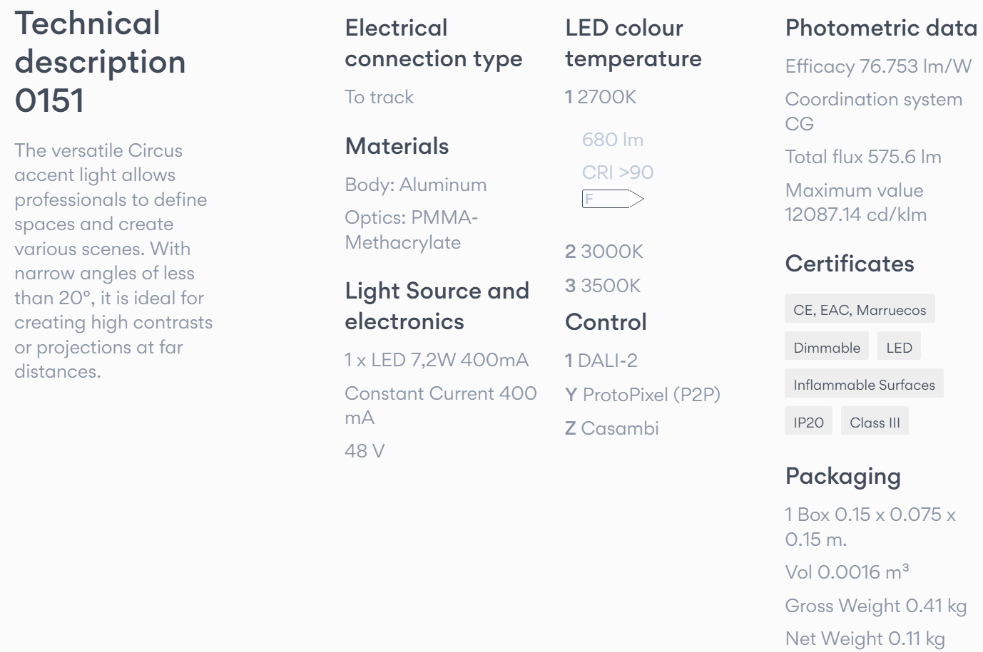 Подвесной светильник Circus 0151 из коллекции Circus — это потолочный акцентный downlight-светильник для трековых подвесных систем. Узкий угол света менее 20° создаёт контрастное освещение и дальние проекции, также доступны Medium (20–40°) и Wide (>40°). Оснащён LED 7,2W (CRI>90) с цветовой температурой 2700K, 3000K или 3500K, управление через DALI-2, ProtoPixel или Casambi. Корпус из алюминия, оптика из метакрилата. Светильник доступен в чёрном и бежевом цвете.