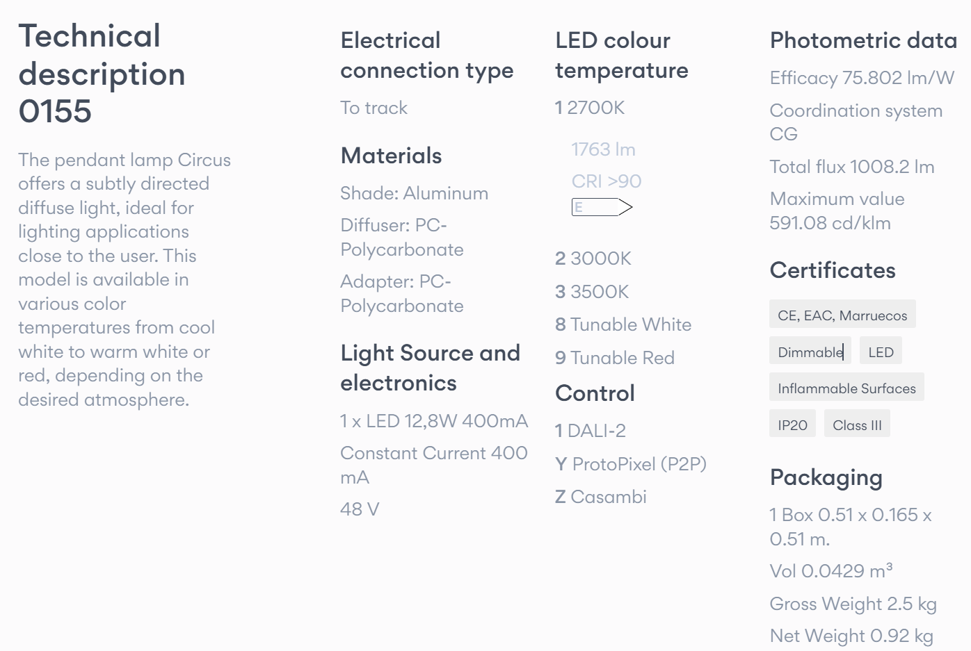 Подвесной светильник Circus 0155 —  один из элементов коллекции Circus. Плафон диаметром 40 см выполнен из алюминия с поликарбонатным рассеивателем. Оснащён LED 12,8W с высоким индексом цветопередачи (CRI>90) и выбором цветовой температуры от тёплого до нейтрального белого или регулируемого света. Управляется через DALI-2, ProtoPixel или Casambi. Доступен в чёрном и бежевом цвете. Максимальная длина подвеса 200 см.