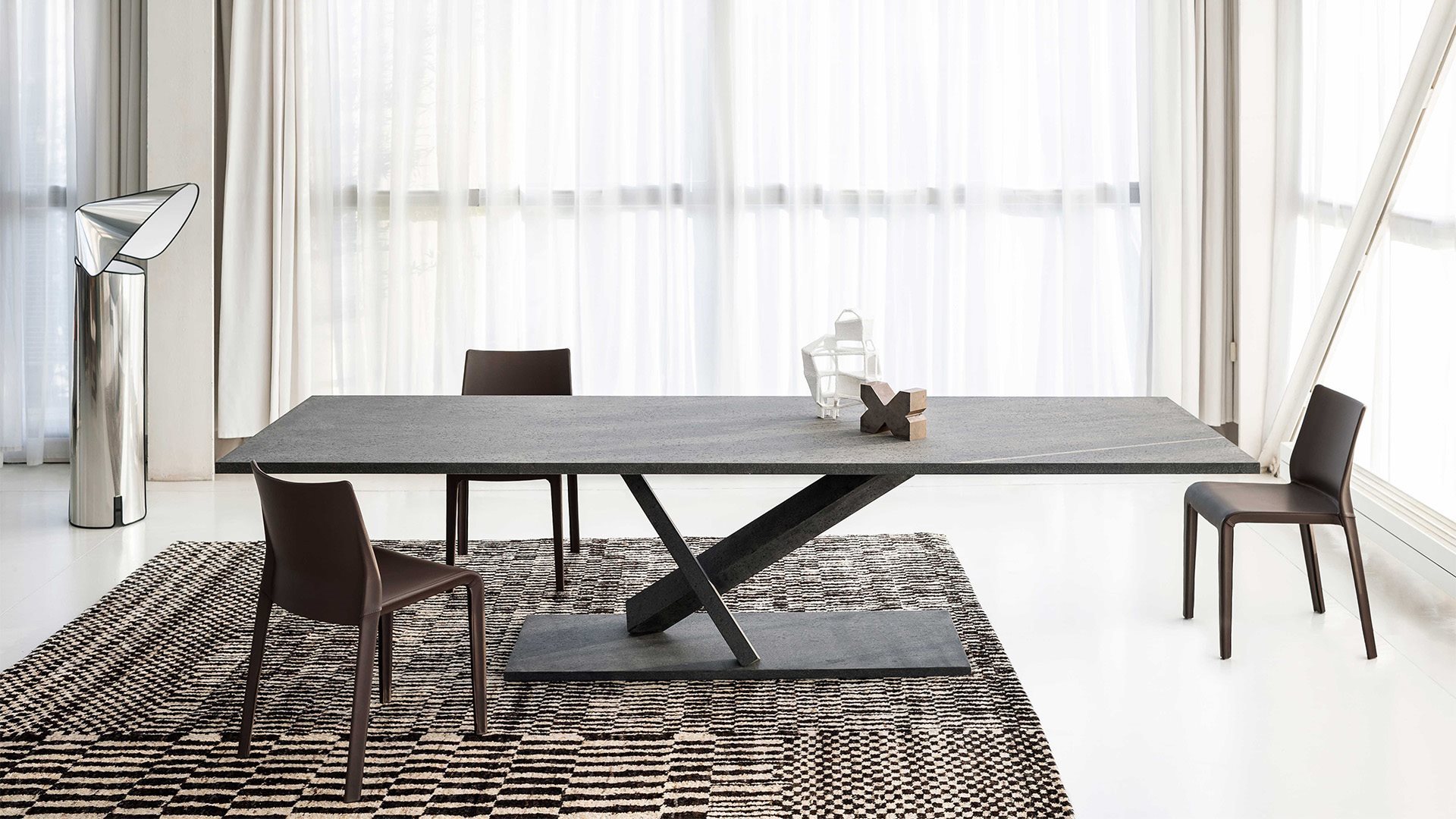 Столы Element от Desalto, созданные Токуджином Ёсиокой, — это архитектурные модели с узнаваемой конструкцией: металлическая центральная опора соединяет две горизонтальные плоскости, обеспечивая высокую устойчивость и визуальную лёгкость. Характерная отделка чёрный цемент подчёркивает скульптурный вид столов.