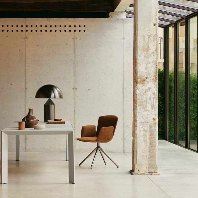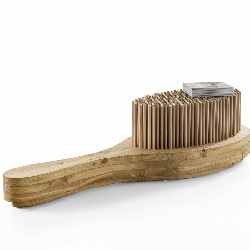 Проект Modular Imagination, разработанный Вирджилом Абло, исследует границы между предметным дизайном и архитектурой. Это модульные блоки, которые используют как пуфы, скамьи или приставные столики. В основе конструкции лежит жесткий каркас из переработанной древесины. Мягкий слой выполнен из полиуретана, содержащего полиолы из возобновляемых биологических источников. Внешнее покрытие из окрашенного эластомера придает поверхности матовую фактуру и обеспечивает износостойкость. Характерный элемент — цилиндрические ножки оранжевого цвета из полимера Hytrel. Они фиксируются резьбовыми стальными вставками, что упрощает разборку изделия для утилизации. Строгая геометрия модулей позволяет составлять их вместе, формируя различные конфигурации для жилых или общественных пространств.