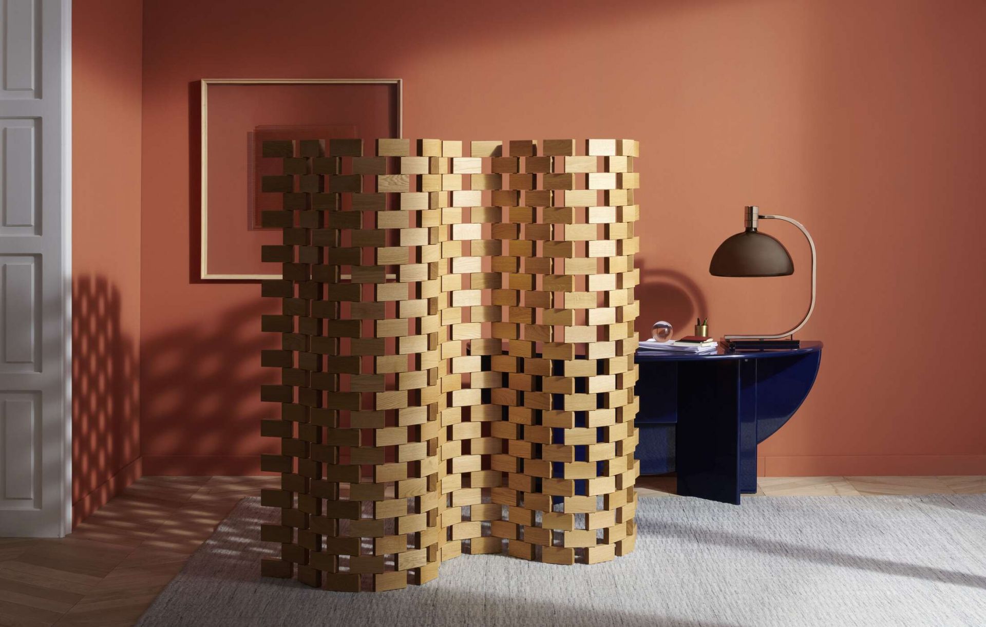 Ширма Paravent Ambassade, разработанная Шарлоттой Перьян, представляет собой гибкую систему для зонирования интерьера. Конструкция состоит из 331 отдельного деревянного блока. Детали вырезают из массива натурального дуба, мореного дуба или ореха каналетто, тщательно обрабатывая поверхность для сохранения природной фактуры. Элементы соединяются между собой таким образом, что ширма может плавно изгибаться, принимая различные формы. Это позволяет использовать её в помещениях любой конфигурации, создавая функциональные зоны без возведения стационарных стен. Модель сочетает в себе принципы модульности и ремесленного мастерства, характерные для работ Перьян. Благодаря отсутствию жесткой фиксации предмет сохраняет устойчивость в различных положениях.
