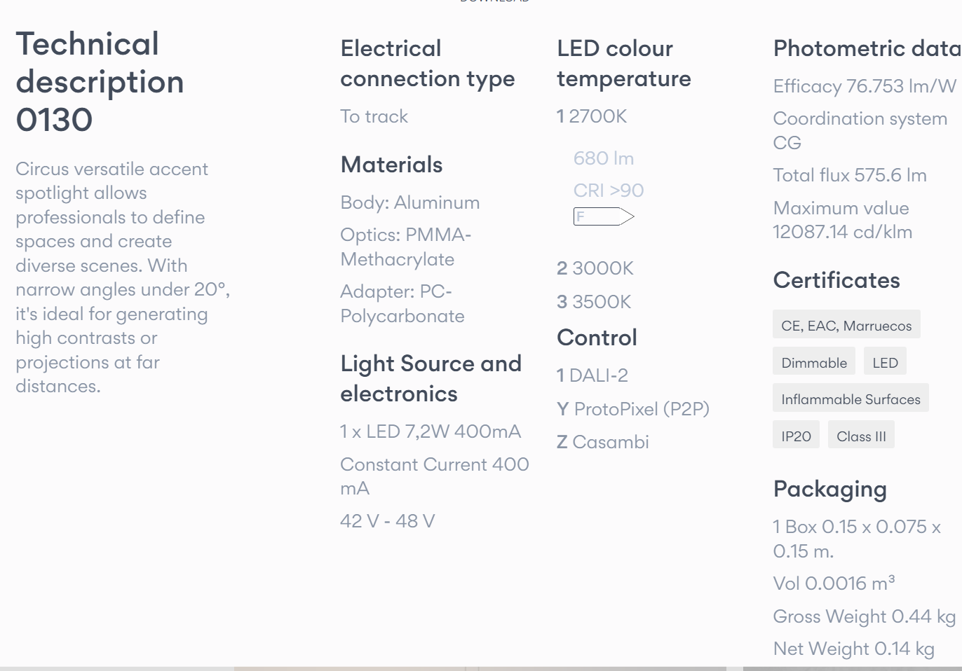 Спот Circus 0130 универсальный акцентный прожектор для монтажа только на подвесные треки из коллекции, позволяющий зонировать пространство и создавать разные световые сцены. Узкий угол света менее 20° идеально подходит для акцентного освещения и проекций на дальние расстояния, также доступны варианты Medium (20–40°) и Wide (>40°). Модель оснащена светодиодом 7,2W (CRI>90) с температурой света 2700K, 3000K или 3500K, а также регулируемыми режимами Tunable White и Tunable Red. Корпус выполнен из алюминия, оптика — из метакрилата, адаптер — из поликарбоната. Управление осуществляется через DALI-2, ProtoPixel или Casambi. Светильник доступен в чёрном и бежевом цвете.