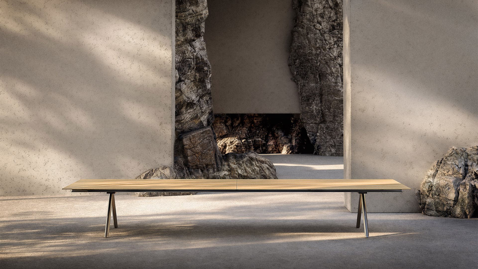 Основание выполнено из стального каркаса, который гармонично дополняет строгую геометрию балки. Модель предлагает широкие возможности персонализации благодаря выбору материалов столешницы. Для ценителей инноваций доступен материал Fenix с функцией самовосстановления микроцарапин, для любителей природных фактур — массив ясеня, а зеркальная поверхность добавит пространству глубины. Вариативность размеров позволяет использовать Heb как в качестве обеденного стола в жилом интерьере, так и в роли переговорной зоны в офисе.