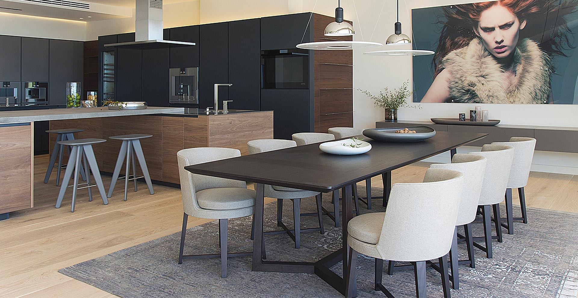 Стол Jiff, разработанный Design Center бренда Flexform, построен на концепции мономатериала. В этой модели и каркас, и столешница выполнены из одной породы дерева, что создает визуально целостный и гармоничный образ. Для изготовления используют массив ясеня или ореха Каналетто, подчеркивая естественную фактуру и теплоту древесины.