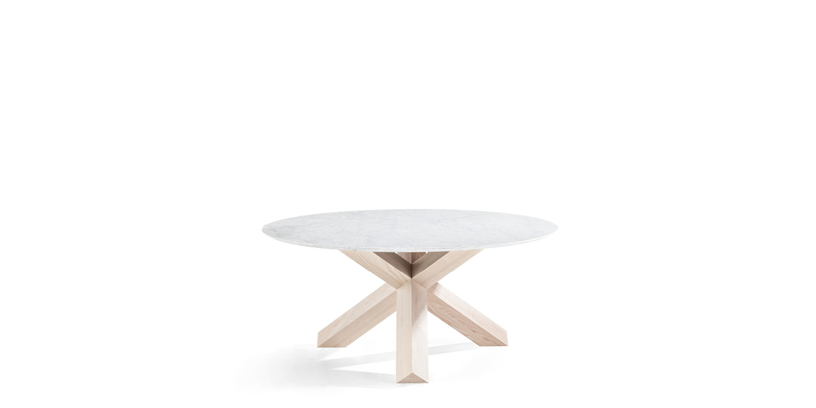 Стол La Rotonda, спроектированный Марио Беллини в 1976 году, демонстрирует архитектурный подход к дизайну мебели. Основание состоит из трех массивных деревянных элементов квадратного сечения, которые пересекаются по диагонали, образуя устойчивую конструкцию. Врезные соединения деревянных частей выполнены с высокой точностью и выступают важной визуальной деталью, подчеркивающей мастерство работы с массивом. Столешница изготовлена из цельного натурального мрамора. Природный рисунок камня и его прожилки делают каждый экземпляр отличным от других. Поверхность тщательно полируют вручную для достижения идеальной гладкости. Круглая форма способствует комфортному общению, а сочетание дерева и камня позволяет использовать модель в интерьерах различной стилистики. Cassina производит этот предмет, объединяя современные технологии с традиционными методами обработки материалов.