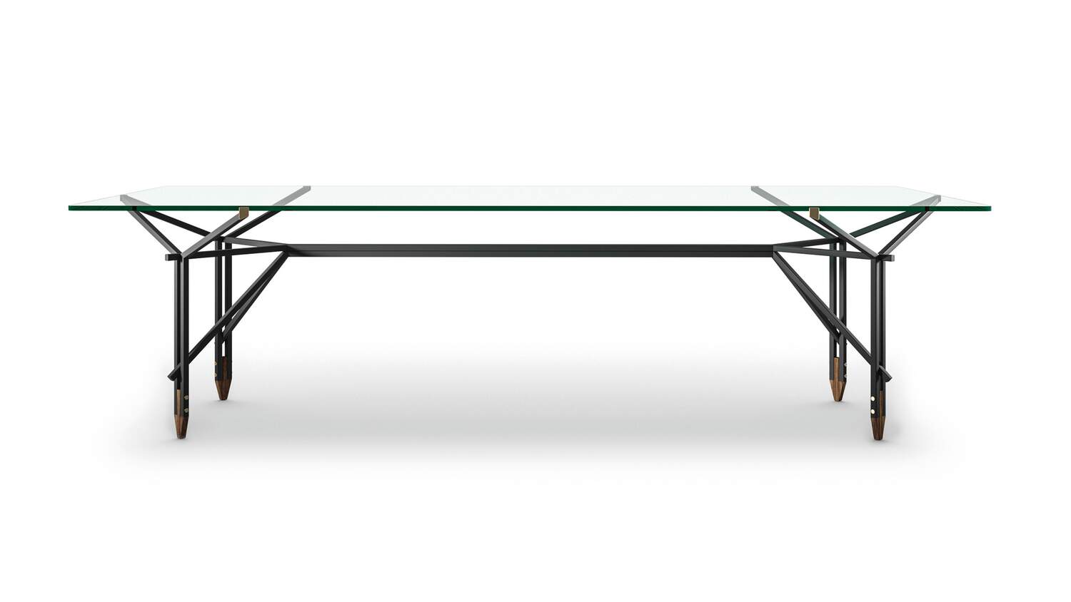 Модель 815 Olimpino, разработанная Ико Паризи в 1955 году, демонстрирует архитектурный подход к дизайну мебели, свойственный итальянскому модернизму середины XX века. Основание стола представляет собой сложную конструкцию из тонких металлических трубок квадратного сечения. Рама окрашена в матовый черный цвет, подчеркивающий графичность силуэта. Дизайнер намеренно оставляет видимыми крепежные элементы и винты, превращая их в эстетический акцент. Характерной деталью служат оригинальные металлические наконечники ножек, напоминающие стрелы. Столешница выполнена из закаленного стекла, что позволяет полностью раскрыть геометрию каркаса. Прозрачный материал визуально облегчает предмет, сохраняя ощущение простора в интерьере. Cassina производит эту модель, сочетая промышленные технологии обработки металла с внимательной ручной сборкой.