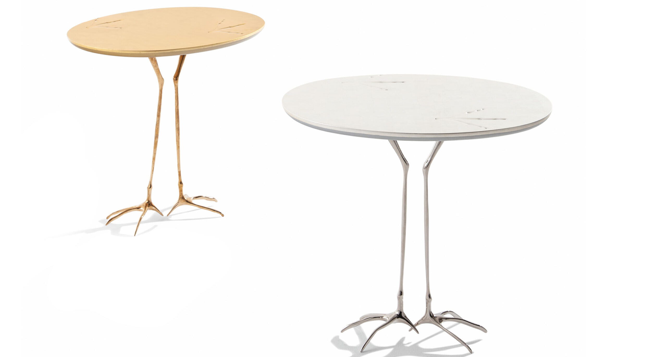 Столик Traccia — знаковый предмет сюрреалистического дизайна, разработанный Мерет Оппенгейм в 1939 году. Модель, вошедшая в коллекцию Simon Collezione, демонстрирует нестандартный подход к форме: бронзовые ножки имитируют лапы фантастической птицы, а на столешнице символически запечатлены ее следы. Основание отливают из бронзы с высокой точностью детализации. Каркас доступен в двух вариантах отделки: полированная бронза или серебряное покрытие. Столешница эллиптической формы изготовлена из многослойной фанеры. Мастера вручную наносят на нее тончайшие листы желтого или белого сусального золота, создавая гладкую мерцающую поверхность. Traccia сочетает скульптурную выразительность с утилитарной функцией, выступая в роли акцентного приставного столика. Использование драгоценных металлов и ручная работа подчеркивают статус предмета, балансирующего на грани искусства и функциональной мебели.