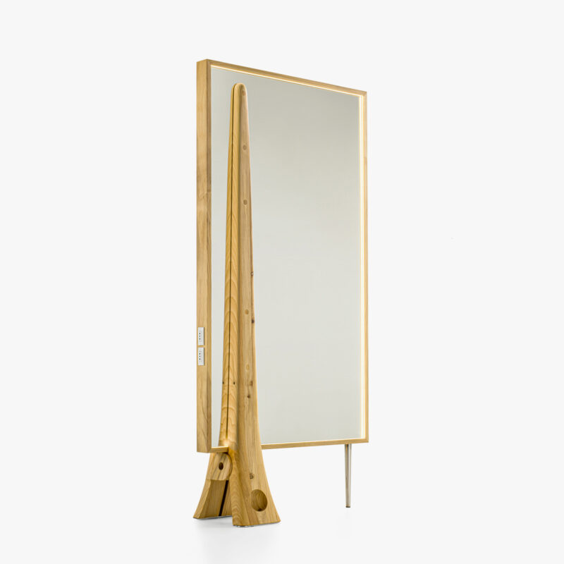 Зеркало Adone — проект дуэта Марконато и Дзаппа для итальянской фабрики Bonaldo. Основным элементом дизайна стала выразительная металлическая рама, которая создает эффект глубины и визуально отделяет отражающую поверхность от стены. Тщательная обработка металла обеспечивает идеально гладкую фактуру и четкие линии профиля. Модель выпускают в двух диаметрах — 90 и 190 см, что позволяет использовать ее как одиночный акцент или в составе композиции. Для рамы предусмотрены различные варианты финишной отделки: от сдержанного матового черного и хрома до теплых оттенков меди и золота. Лаконичная круглой форма и вариативность материалов делают Adone универсальным решением для прихожих, спален и гостиных зон.