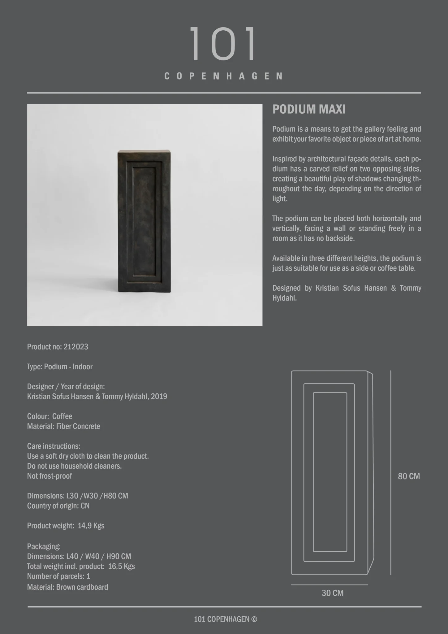 Столик Podium от 101 Copenhagen, разработанный Кристианом Софусом Хансеном и Томми Хюльдалем, превращает интерьер в персональную галерею, позволяя эффектно выставить любимые объекты или произведения искусства. Вдохновлённый архитектурными деталями фасадов, он оснащён резным рельефом с двух противоположных сторон, создавая красивую игру света и тени в течение дня. Podium универсален: его можно располагать горизонтально или вертикально, у стены или в центре комнаты, так как задняя сторона отсутствует. Доступен в трёх разных высотах, он также идеально подходит для использования в качестве кофейного или приставного столика. Материал — фибробетон, цвет — Coffee. Размеры столика Podium Maxi: длина 30 см, ширина 30 см, высота 80 см.