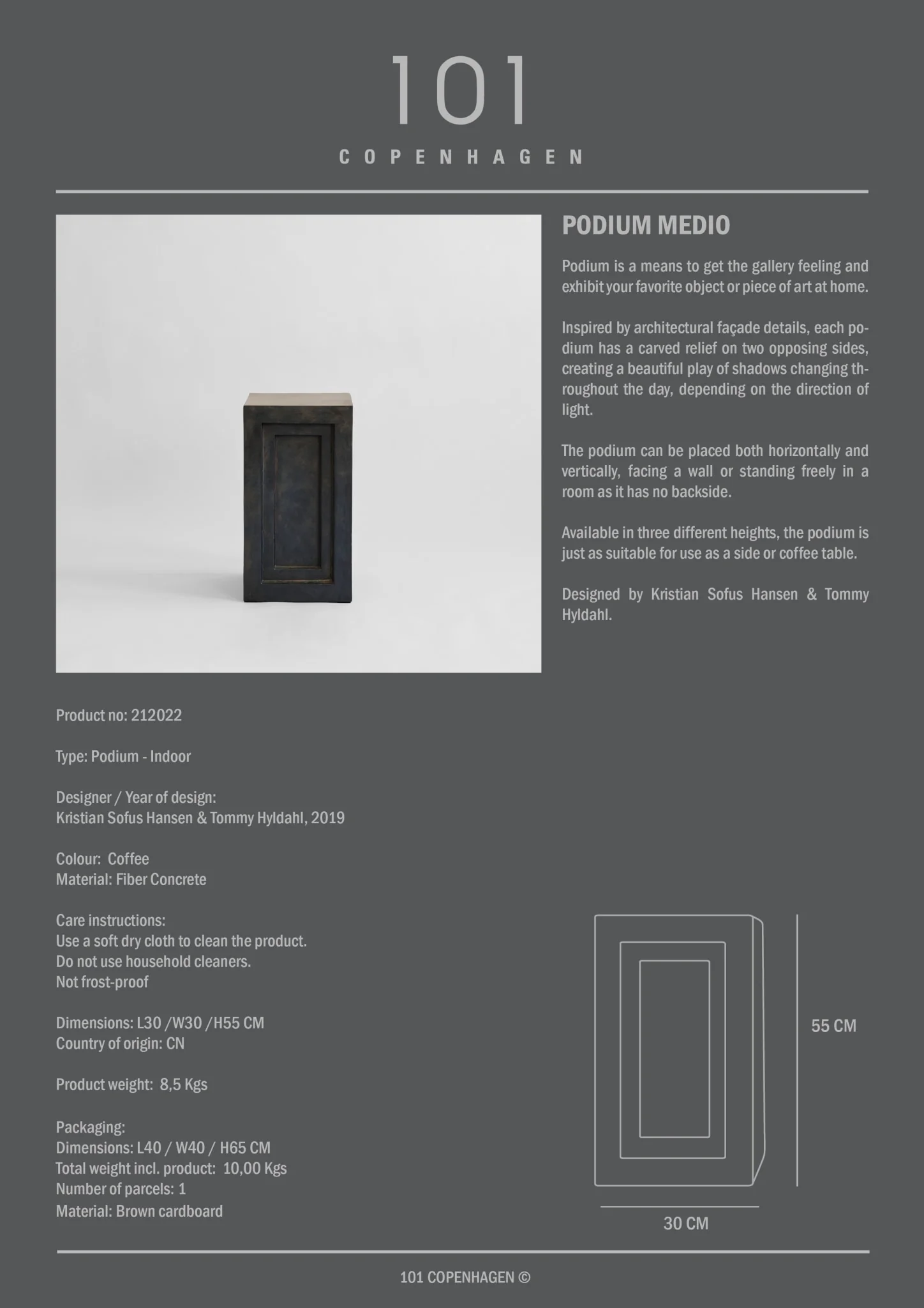 Столик Podium от 101 Copenhagen, разработанный Кристианом Софусом Хансеном и Томми Хюльдалем, превращает интерьер в персональную галерею, позволяя эффектно выставить любимые объекты или произведения искусства. Вдохновлённый архитектурными деталями фасадов, он оснащён резным рельефом с двух противоположных сторон, создавая красивую игру света и тени в течение дня. Podium универсален: его можно располагать горизонтально или вертикально, у стены или в центре комнаты, так как задняя сторона отсутствует. Доступен в трёх разных высотах, он также идеально подходит для использования в качестве кофейного или приставного столика. Материал — фибробетон, цвет — Coffee. Размеры столика Podium Medio: длина 30 см, ширина 30 см, высота 55 см.