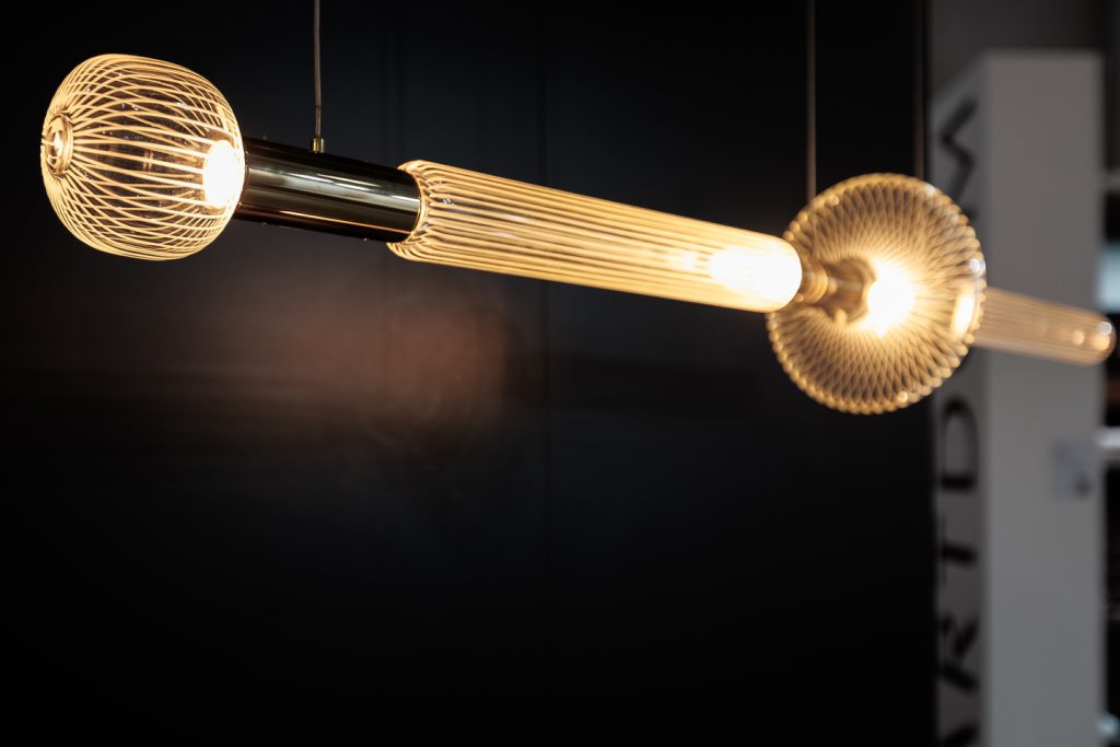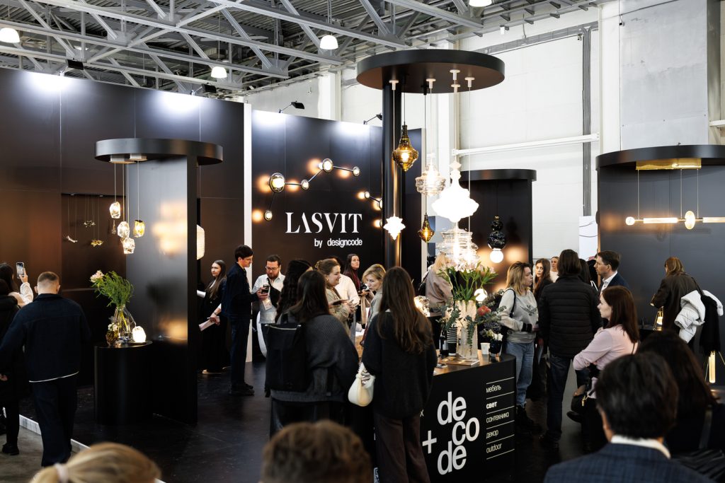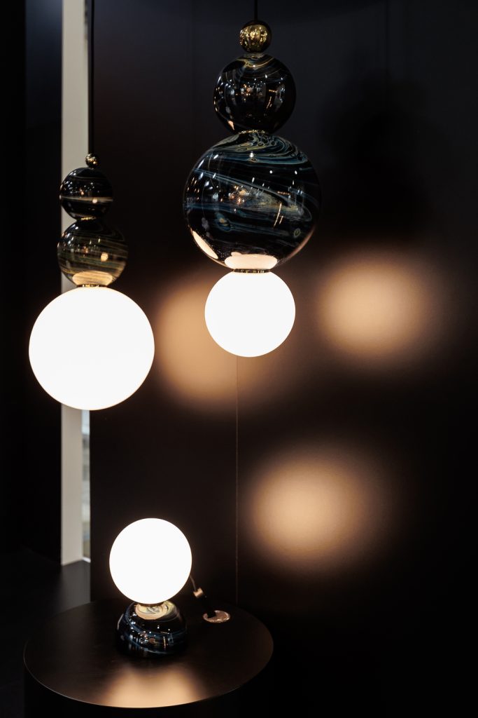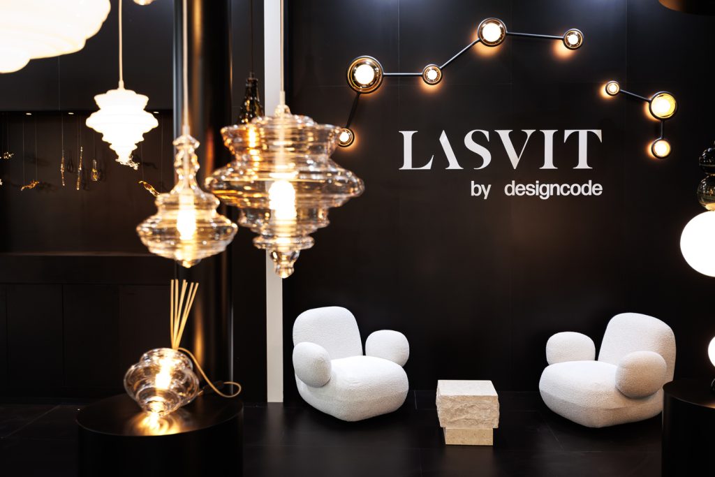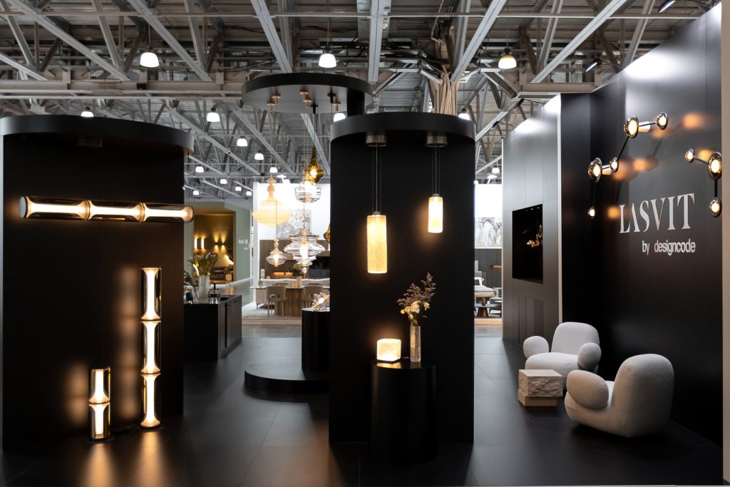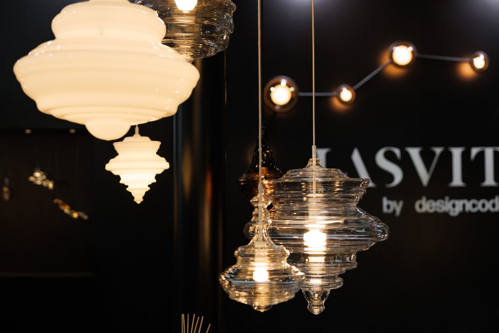Стенд Lasvit построен как четкая пространственная композиция. Каждая коллекция размещена с на заметной дистанции друг от друга, чтобы сохранить масштаб и характер формы световых объектов чешского бренда.