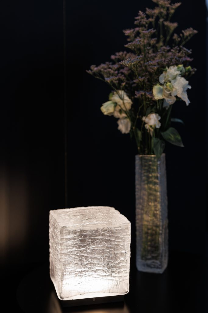 Cipher — выдувное стекло с четкой вертикальной структурой и графичным силуэтом, где свет подчеркивает глубину и рельеф материала.
